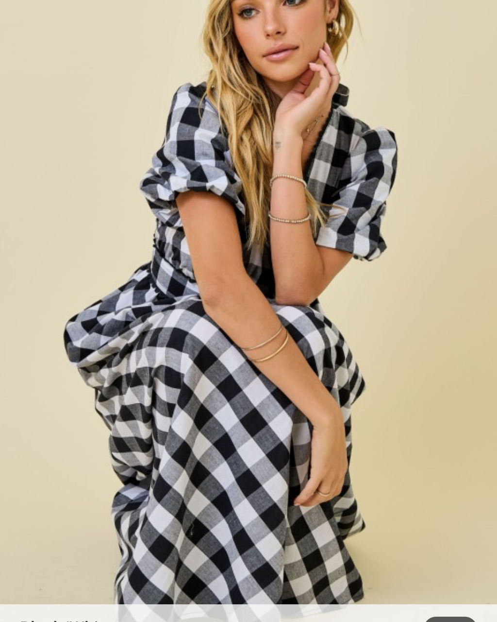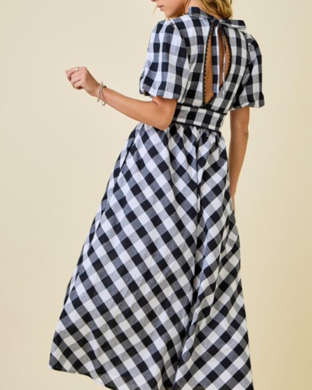 Gingham V neck midi dress with puff sleeves. Tie at the back. Black and white. With Pockets