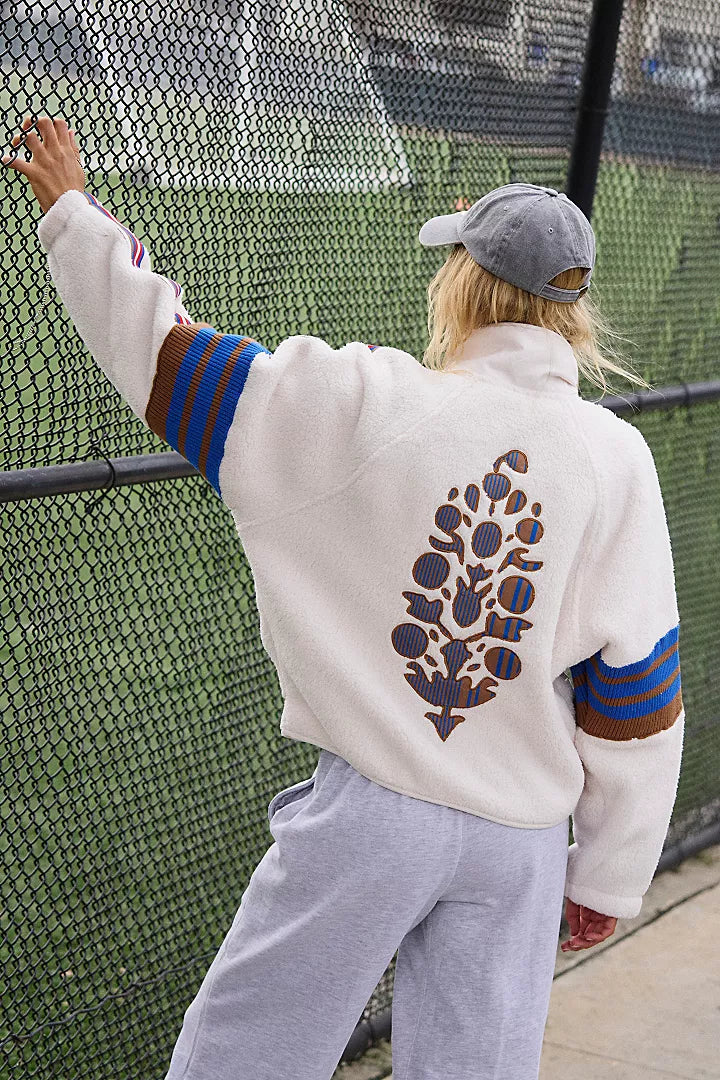 The Mountain High Fleece you know and love in a full-zip silhouette, topped with sporty stripes and an oversized Buti logo. Cozy fleece is crafted with a high neckline, bold striping throughout, and adjustable drawcord hem.