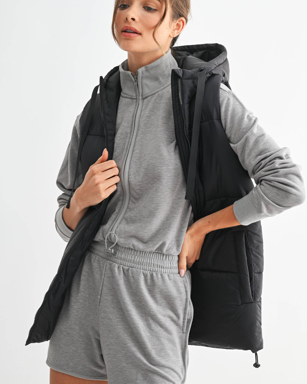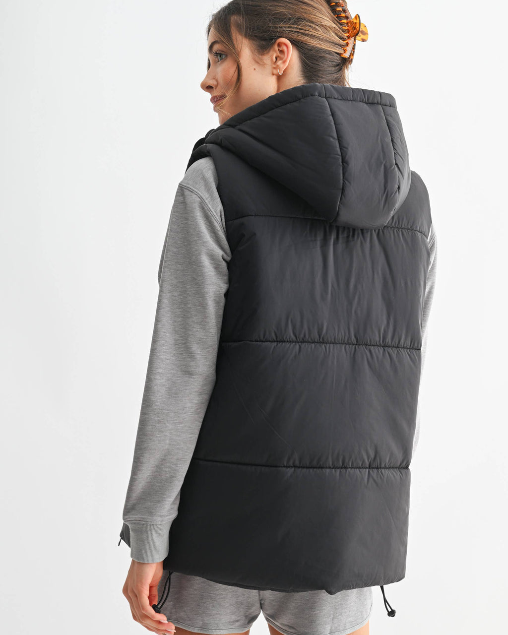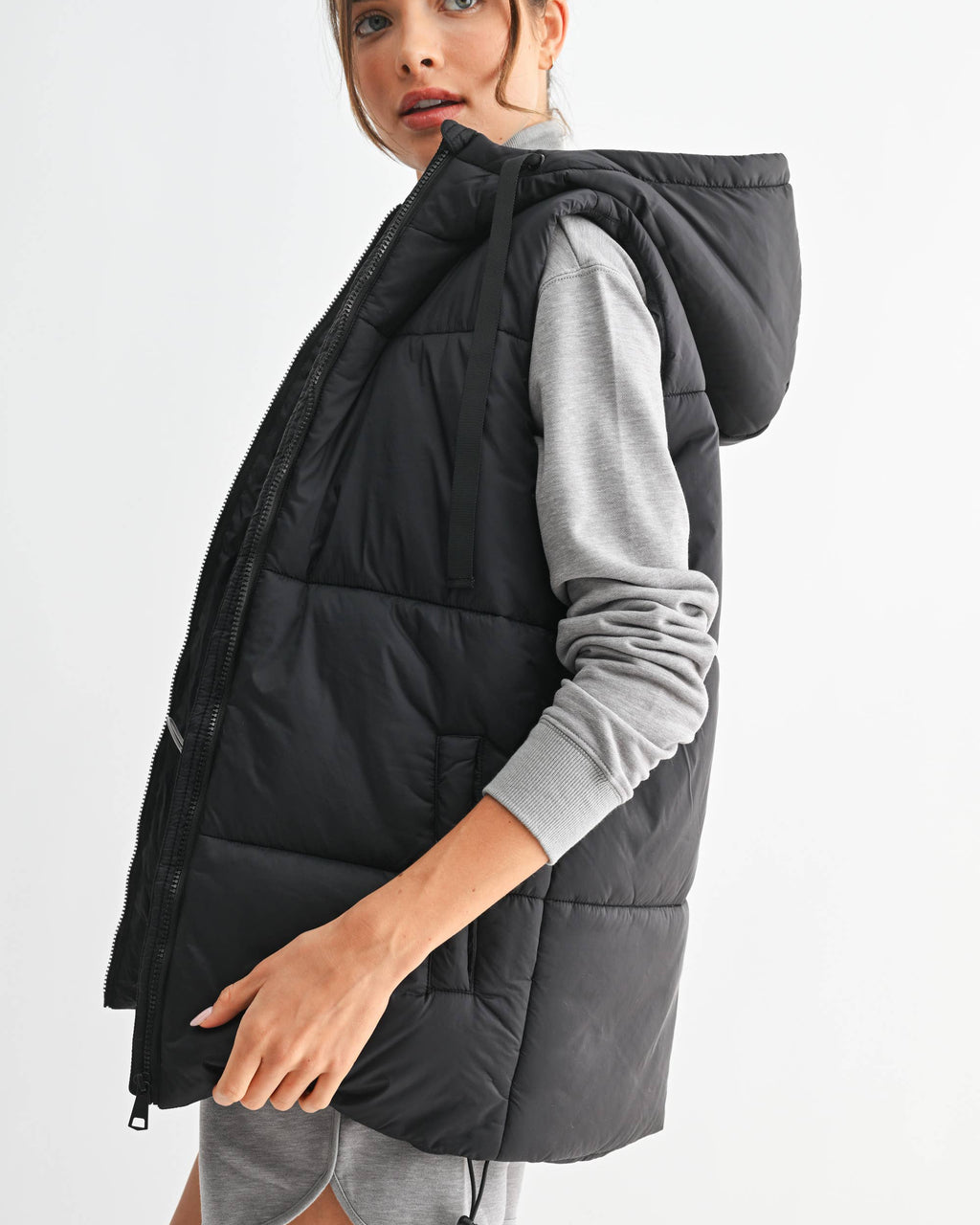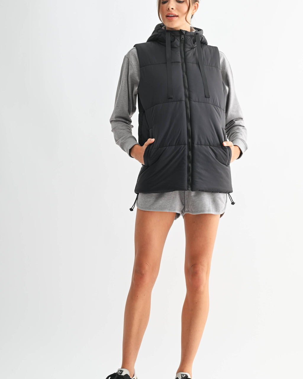 Stay cozy and stylish as the seasons change with our longline poly-fill padded vest. Designed for lightweight warmth, this versatile layer features a full front zip with protective facing, a three-panel hood with adjustable drawcord, and a high neck for extra coverage. Side hand pockets add function, while the adjustable bungee hem helps lock in warmth. Lauren is 5'7", wears a size 2, and is styled here in size S. Made from 100% nylon for durability and comfort.