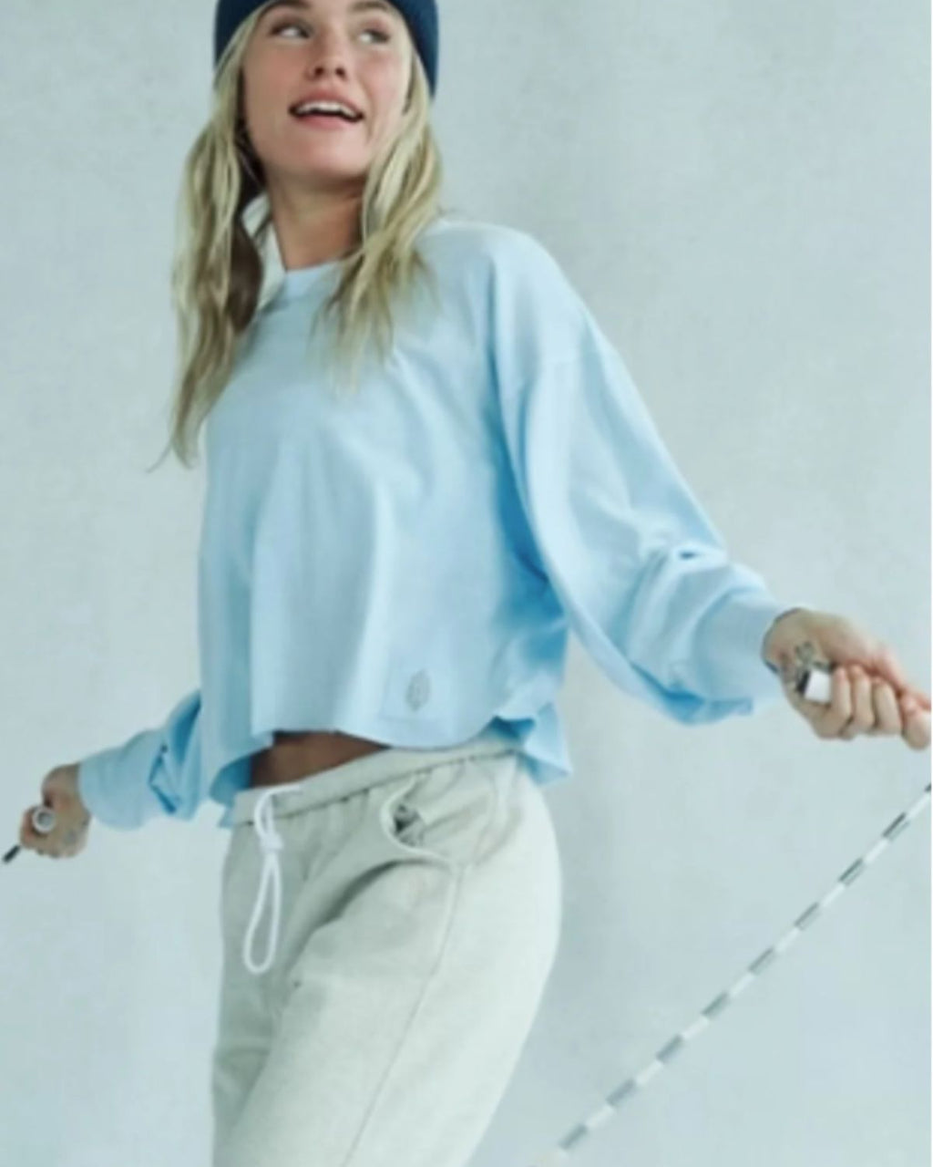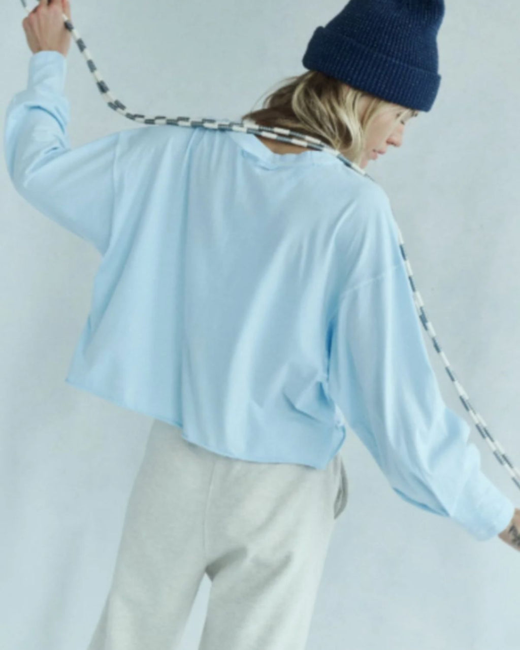 Warm up or cool down in this essential long-sleeve, featured in a boxy silhouette and slightly cropped fit with a classic crew neckline and raw-edge trim.