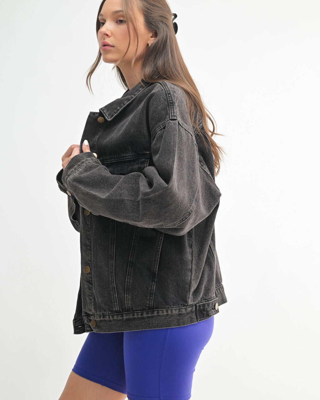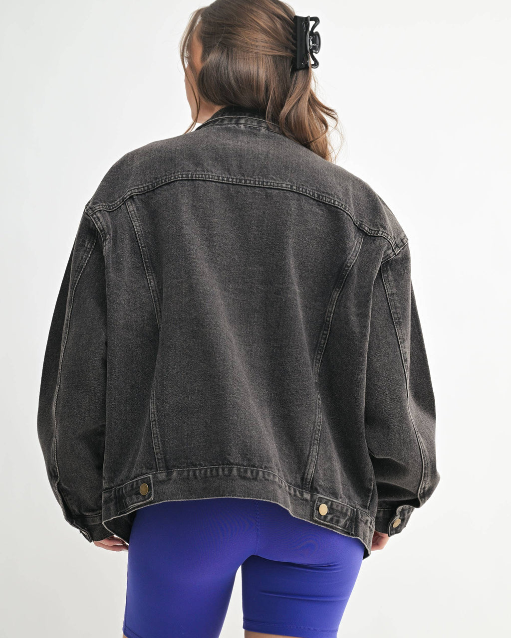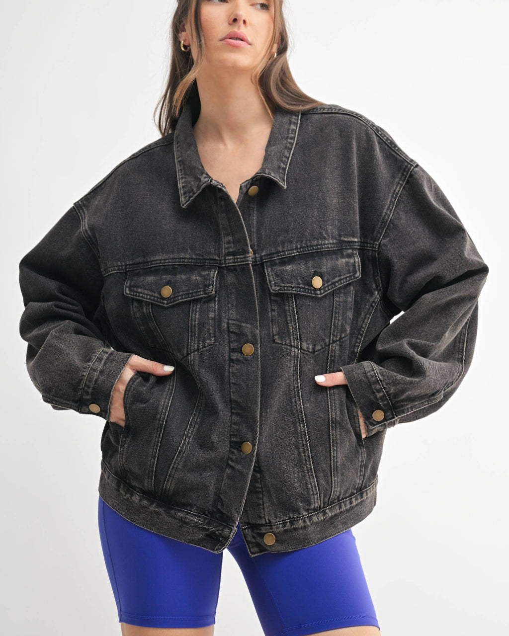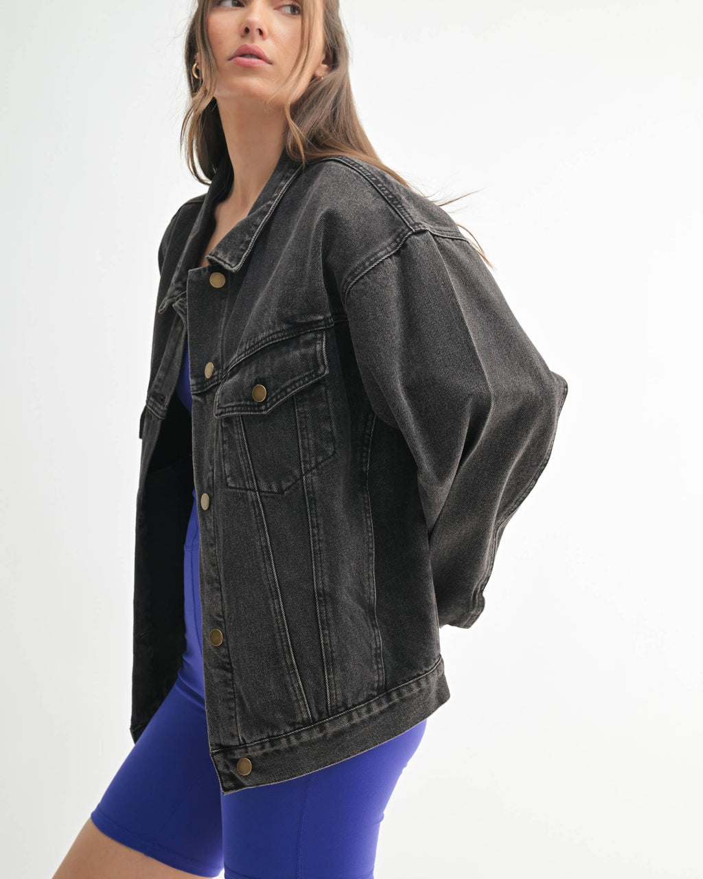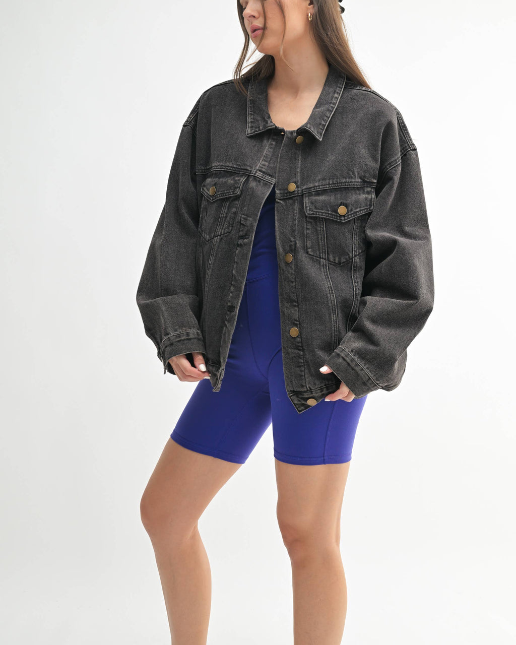 Effortlessly cool and easy to style, this boxy denim jacket brings relaxed vibes to any look. Crafted from 100% cotton, it’s the perfect layer to throw over your activewear or casual outfits. Designed with two breast pockets, two side pockets, and classic metal button closures, it’s a timeless staple with a laid-back edge.