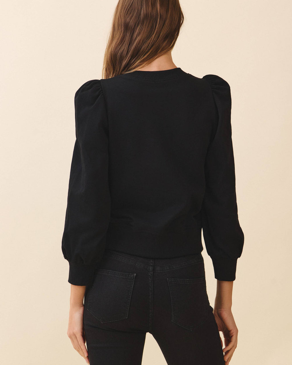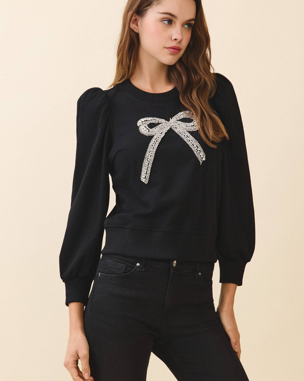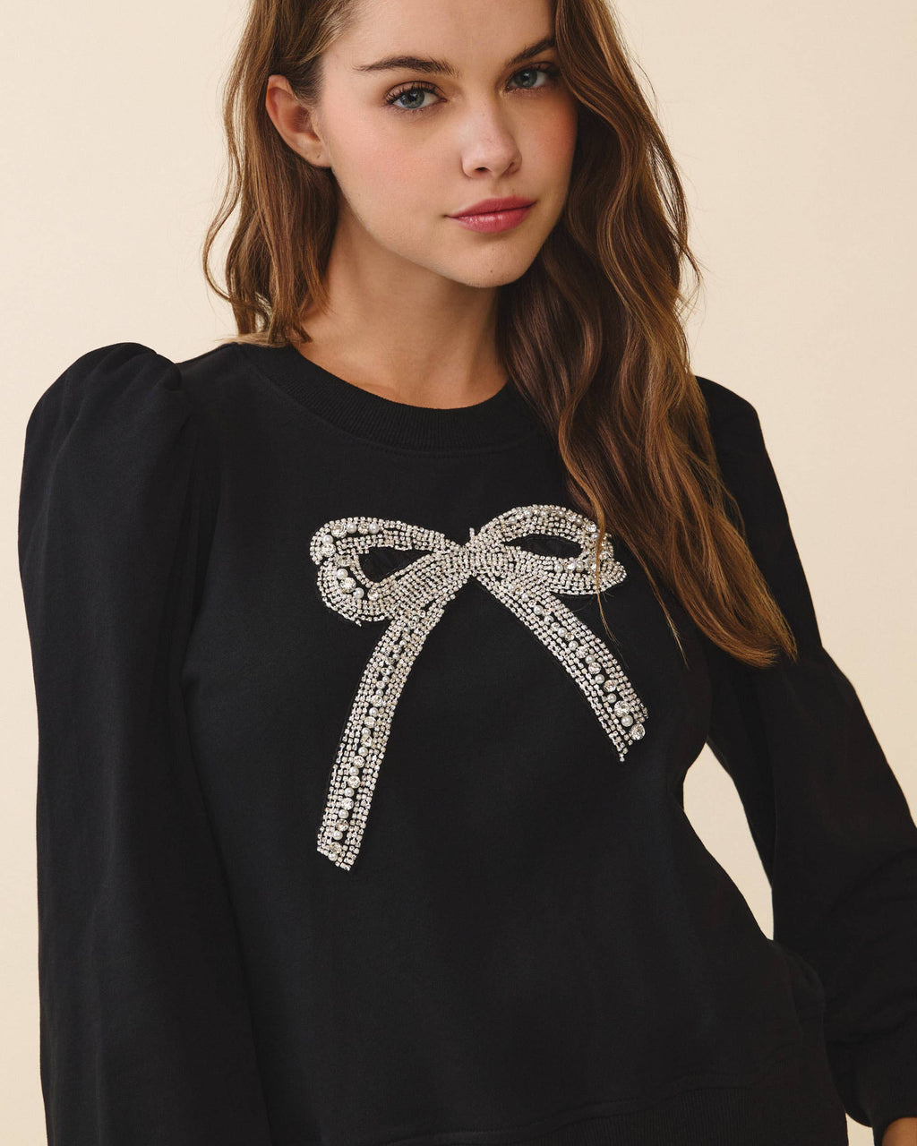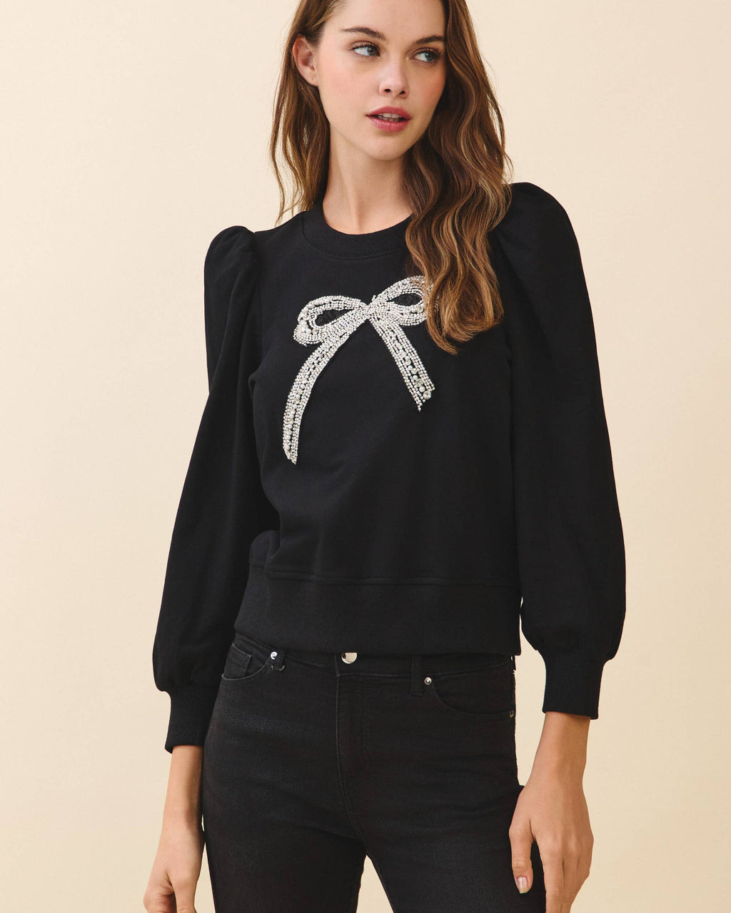Puff sleeve sweatshirt featuring a crew neckline, crystal-embellished bow motif at the front, and ribbed cuffs and hem.