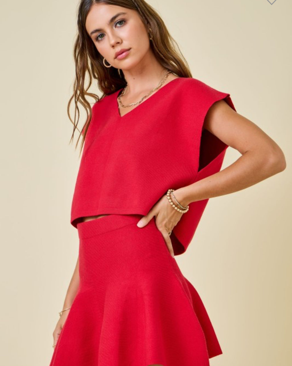 Sleeveless V Neck sweater top & flared mini skirt | red